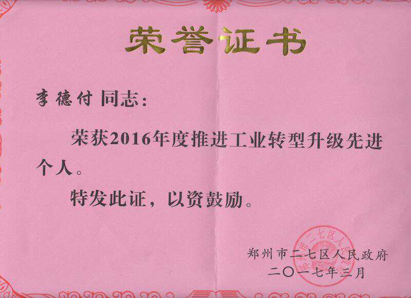 熱烈慶祝 華中食品李德付同志榮獲2016年度推進工業(yè)轉(zhuǎn)型升級先進個人,受到鄭州市二七區(qū)人民政府以政府公文的形式進行高度的宣傳,表彰!我們衷心的向李總表示祝賀!